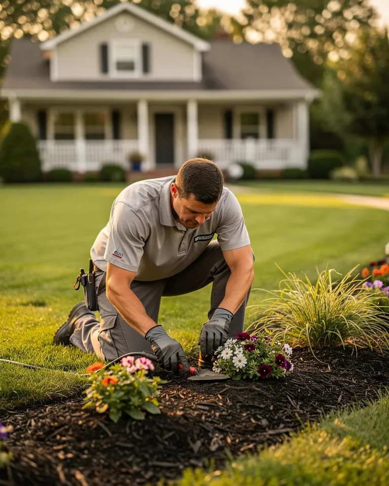 New planting beds, fresh mulch, foundation plantings, and basic cleanup for a typical front or backyard
